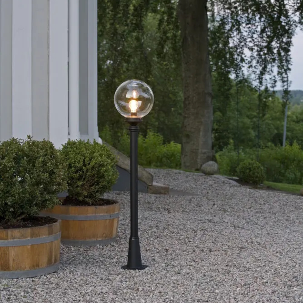 Trädgårdslykta Orion lyktstolpe i lackad aluminium och klart glas E27 med stolpe är en elegant pollare i klassisk design med en stor kupa. Den levereras utan ljuskälla.
