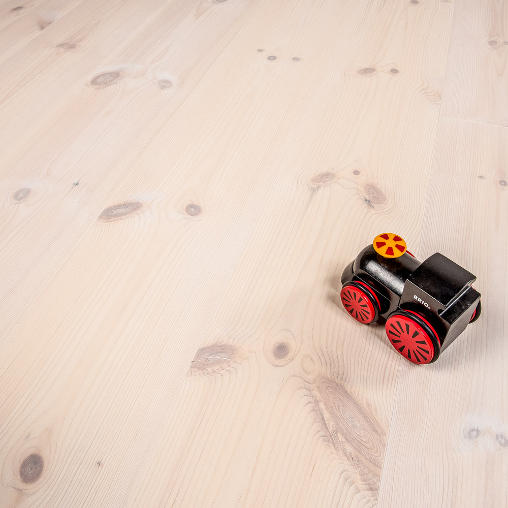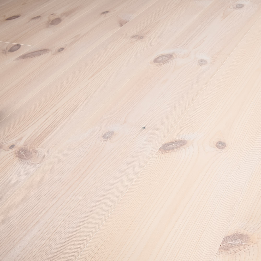 SoftPine Pearl Parkett är ett parkettgolv i furu med vittonad yta och med kvistar i varierande storlek och struktur. Det här är vårt vitaste furugolv. Golvet är ytbehandlat med Osmo dekorvax3188 och Osmo matt vit hårdvaxolja för att få rätt finish och slitstyrka. Det här är ett vackert och klassiskt golv med en modern vit ton.