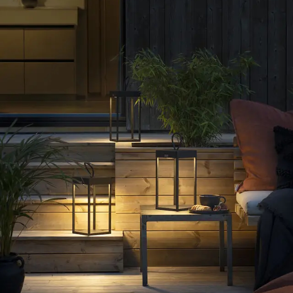 Ravello är en modern, uppladdningsbar lykta med elegant handtag lika praktisk som dekorativ.