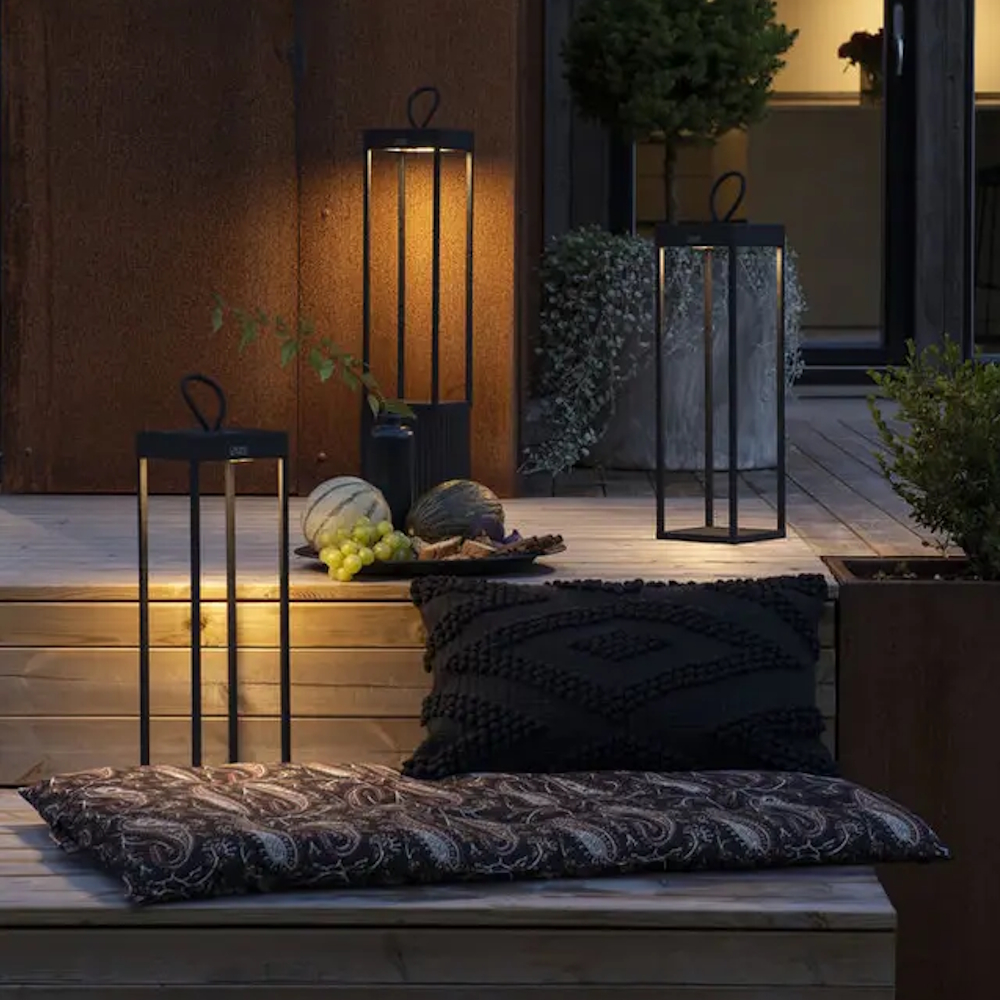 Ravello är en modern, uppladdningsbar lykta med elegant handtag lika praktisk som dekorativ.