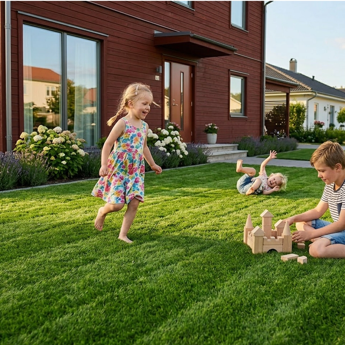 - Mörkare färgton: Den höga andelen ängsgröe hjälper gräsmattan att uppnå den eftertraktade, djupgröna färgen.