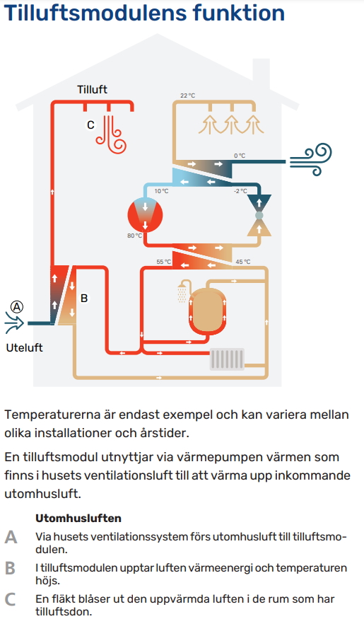 - Tilluftstemperatur är inställbar mellan 16-52 °C. En fast temperatur bestäms, alternativt ändras tilluftstemperaturen i förhållande till utetemperaturen.