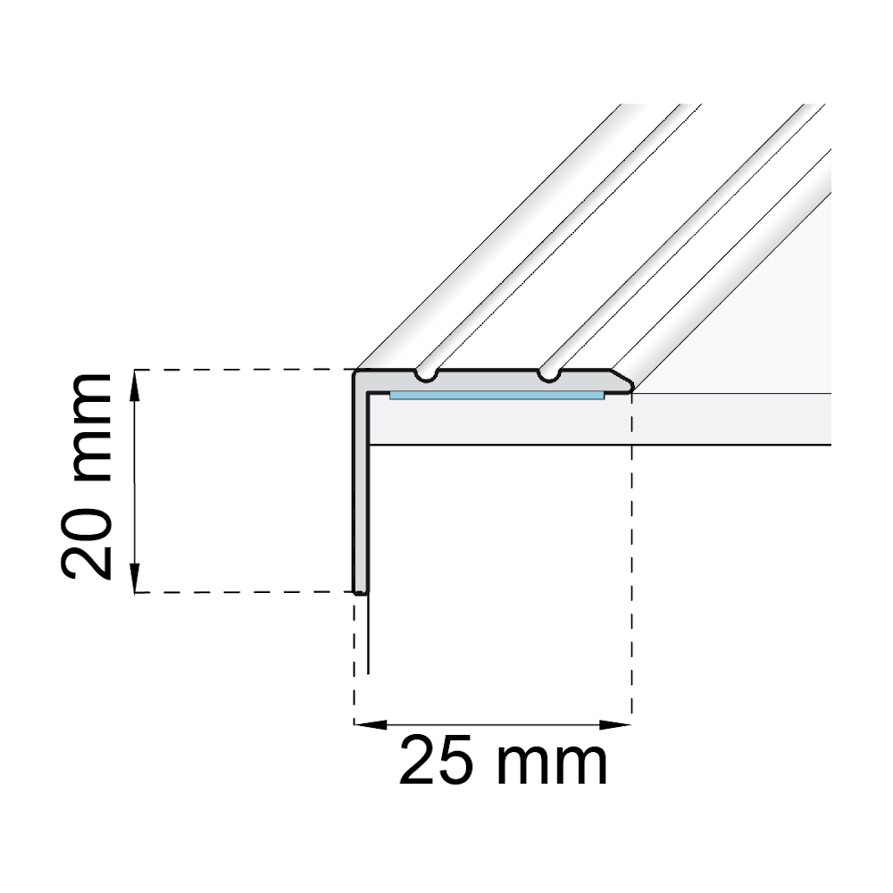 Självhäftande trappkantslist av aluminium. Bredd 25 mm, höjd 20 mm. Längd 2000 mm.