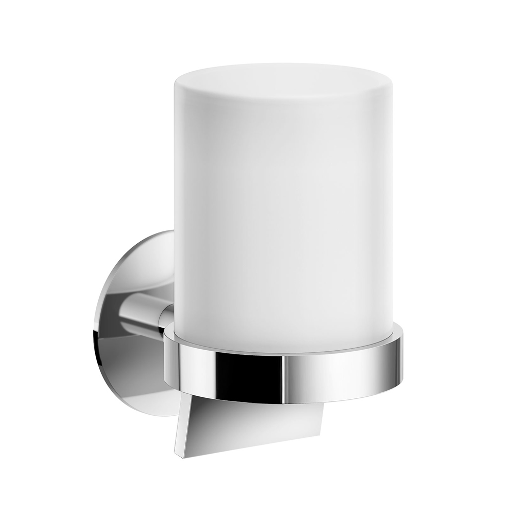 Snygg väggmonterad tvåldispenser med hållare och bakplatta med yta av polerat krom samt behållare i vit plast. 10 års garanti.