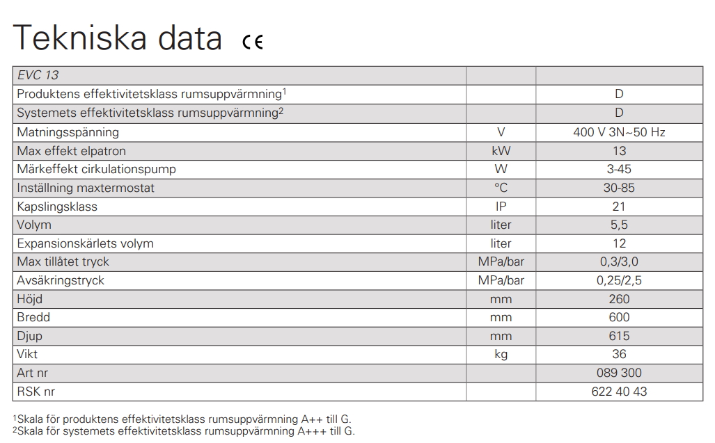 EVC-13. Kompakt elpanna med klimatstyrd värmeautomatik, belastningsvakt, expansionskärl och cirkulationspump. Max effekt 13 kW. Energiklass D
